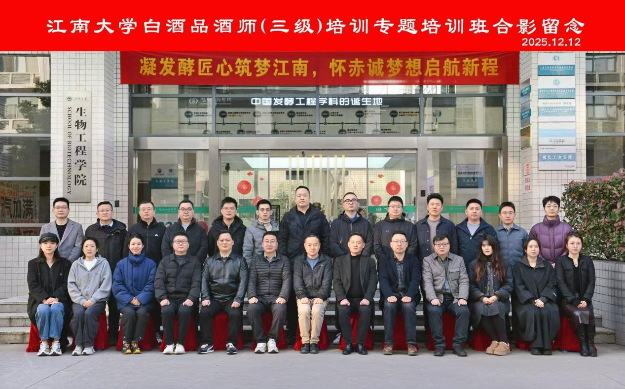 2025年12月12日上午,江南大学白酒品酒师(三级)培训班在江南大学生物工程学院开班。江南大学继续教育学院院长王育红出席开班仪式并讲话,本次培训吸引了23名深耕白酒产业链的学员,他们分别来自生产端、流通渠道及品牌运营等不同领域。
