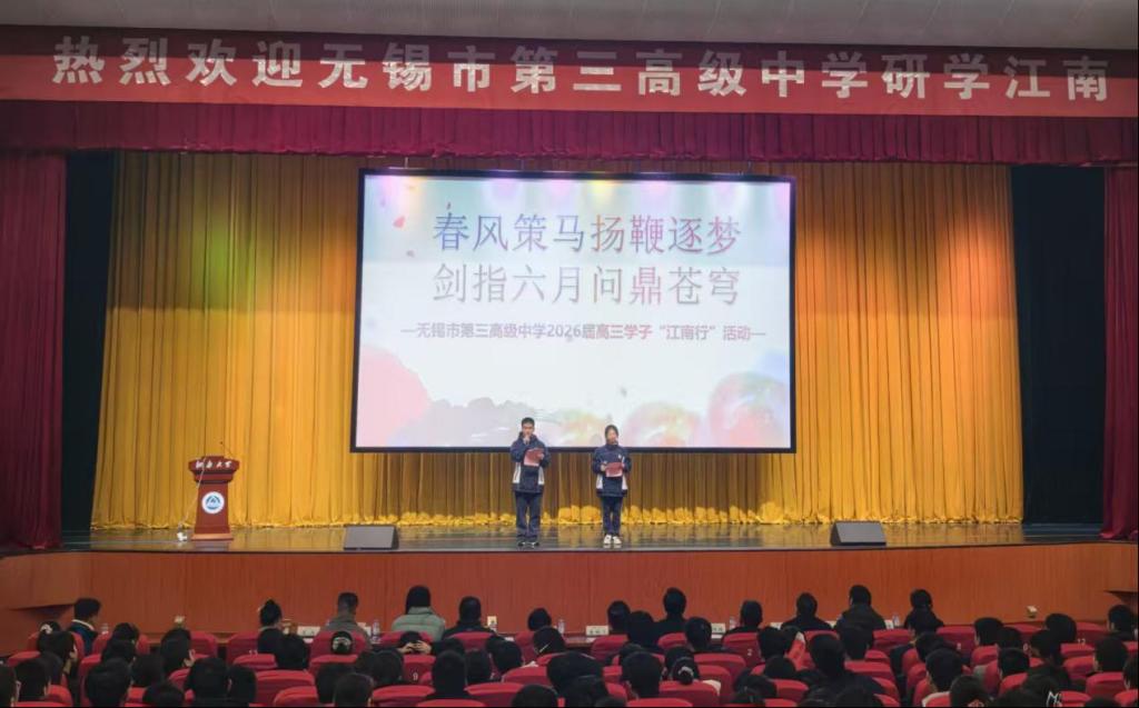 春潮涌动启新程,逐梦青春正当时。2026年3月20日下午,无锡市第三高级中学2026届高三学子走进江南大学,开展以“春风策马扬鞭逐梦 剑指六月问鼎苍穹”为主题的研学活动。无锡市第三高级中学校长毛锡荣、副校长朱鹏飞,江南大学本科生院副院长兼教务处处长黄锋林出席本次活动。