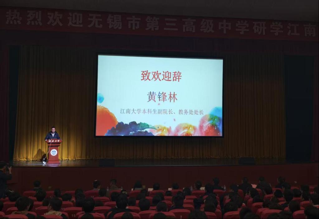 黄锋林代表江南大学致欢迎辞,他对三高中师生的到来表示热烈欢迎,同时向长期为江南大学输送优质生源的三高中致以衷心感谢。他详细介绍了江南大学的办学历史、学科优势与办学成果,从“双一流”建设学科的硬核实力,到ESI全球前万分之一的学科突破,再到软科排名中多个学科的国际领先地位,全方位展现了江南大学的办学实力。他还分享了三高中优秀毕业生在江南大学的成长佳绩,鼓励学子们以榜样为帆,勇攀高考高峰,并向学子们发出诚挚报考邀请。