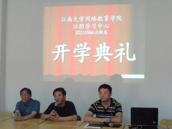 2011年9月18日上午,江南大学网络教育江阴学习中心开学典礼。参加开学典礼的有江南大学网络教育学院副院长孙力、弘成科技发展有限公司总裁助理潘志昕、江阴学习中心校长章明复、副校长沈益。