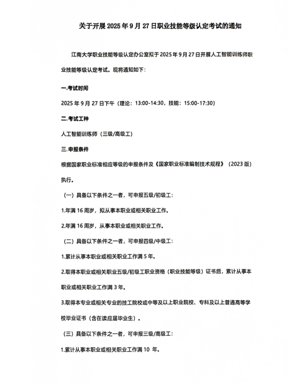 关于开展2025年9月27日职业技能等级认定考试的通知